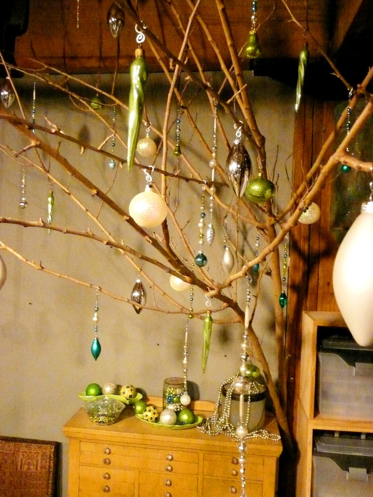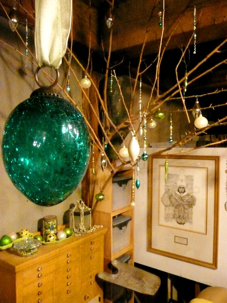 Containers of extra glass garland beads and garlands and ornaments grace the fantastic dental cabinet that belongs to my studio-mate. Tres festive!