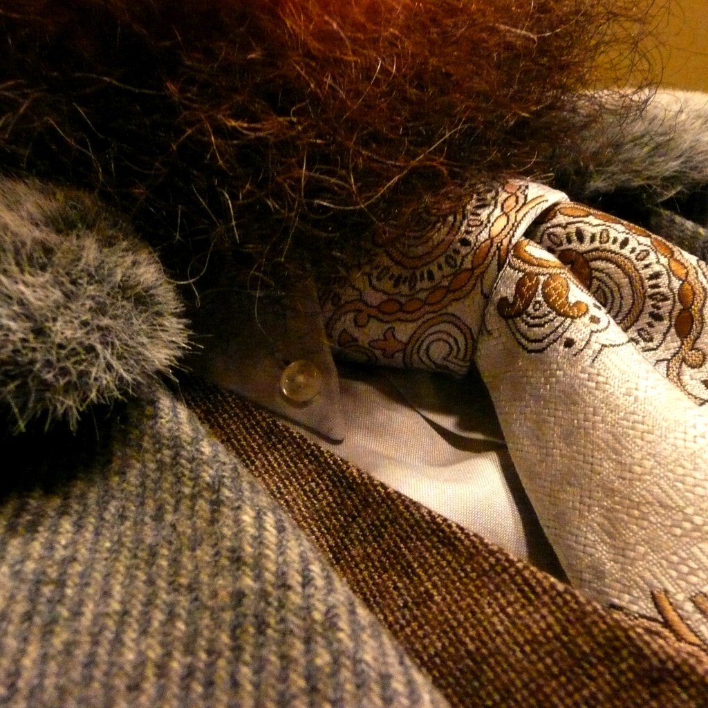 If you noticed, I have been working the faux fur collar thing a bit. I like it. It’s queer; just enough, I think. This one…? OMGs! It isn’t black; first one I’ve seen (well, there was that sable thing but the bitch beat me to it! Grrr…) As I was stitching buttons onto the sport coat, I made a connection: the lining of the collar matched the lining of the jacket exactly. That is when my nipples got rock hard, proving further yet that I was, indeed, feeling better… Seriously. It happened.