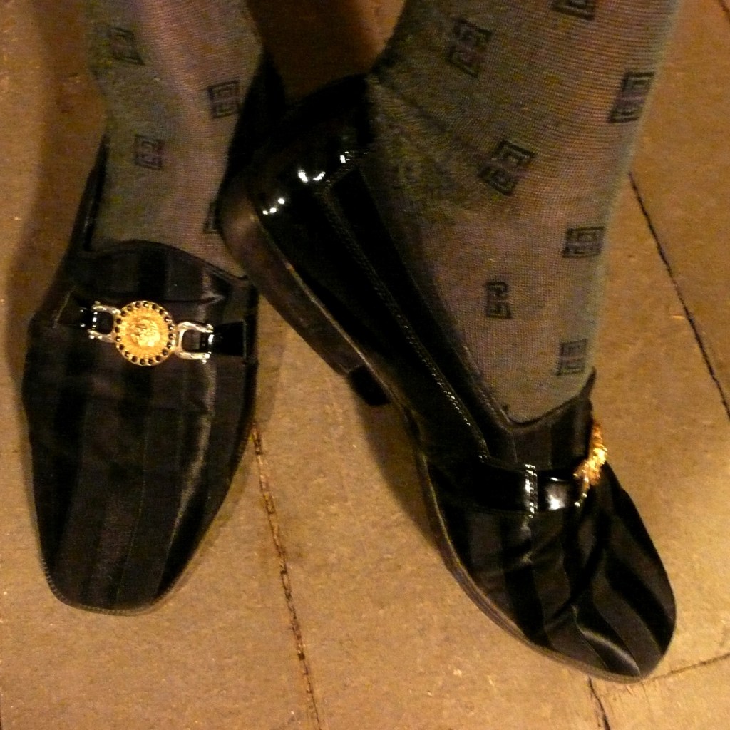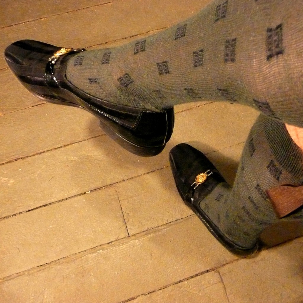 The shoes are kinda crazy. They are Giorgio Brutini: patent leather and something very close to satin grosgrain. Yes, like the ribbon… They can make the perfect fop shoe, I think. True I need to finish proper knickers and all the lacy who-ha to go along, but hey…. I need something to work on during the next cold….