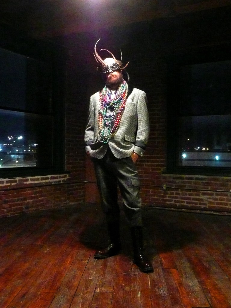 The mask has been around for Halloween and Mardi Gras costumes – in some form or another – for about a decade now. It started as a basic, cheap masquerade mask. I covered it in leather and studded it the first time out… Various things have been attached to it over the years. Since this photos last night, I have added more feathers, filling the voids across the brow.