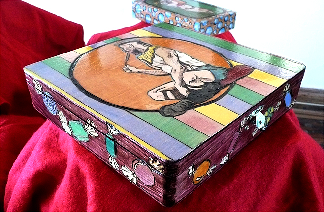 In the show were these fantastic boxes, similar in size and shape to cigar boxes, but they were adorned with wood-burnt images and color stains… One of them was titled Candyman and, you may have guessed it, was inspired by the above costume and pose…