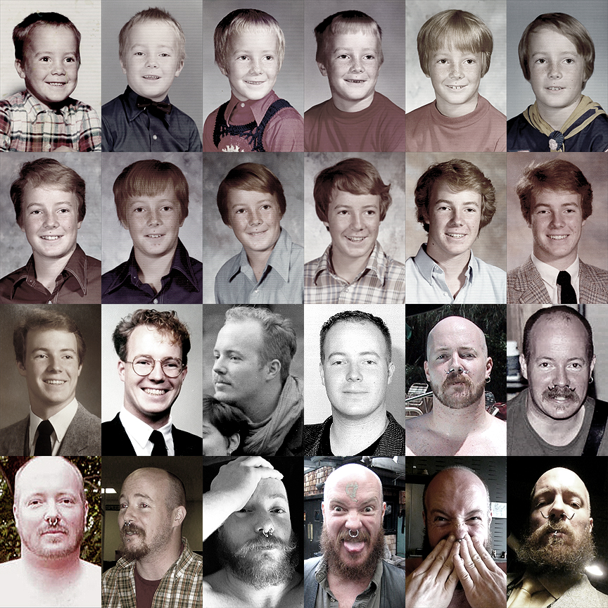 There is a curious thing inside of my brain. I remember how much I hated sitting for photos. Family photos were awful, but school photos were a walking nightmare. I always hated whatever I picked to wear after I had walked to school and was stuck with it for all eternity as of the session in the afternoon. Also inside of my brain is the strong recollection that I was a fat frumpy acne stricken awkward idiot of a child… I am missing ninth grade in the grid, but I have the yearbook and that one is heinous. Truly, an awful photo all the way around…