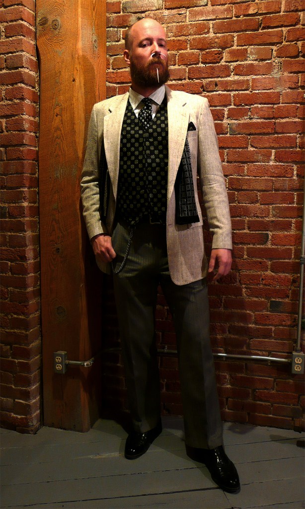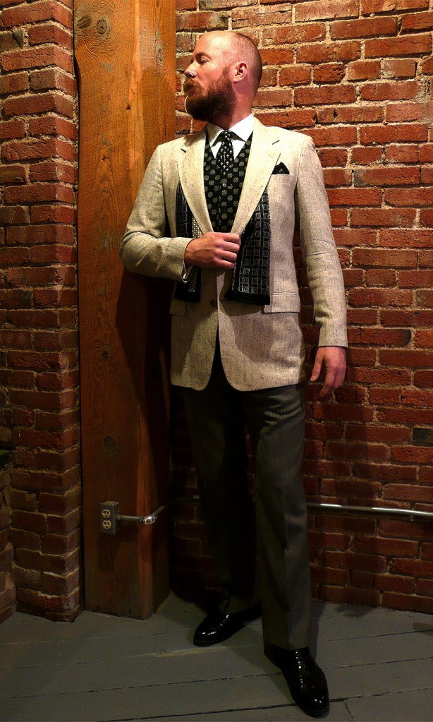 White and grey raw silk jacket, black-n-white linen vest, black-n-white silk fleur-de-lis tie, black-n-white silk scarf, black-n-white silk pocket square…. You get the idea. Not shown: grey herringbone trousers, black-n-white geometric dress socks, and the lovely naked lady sock garters…