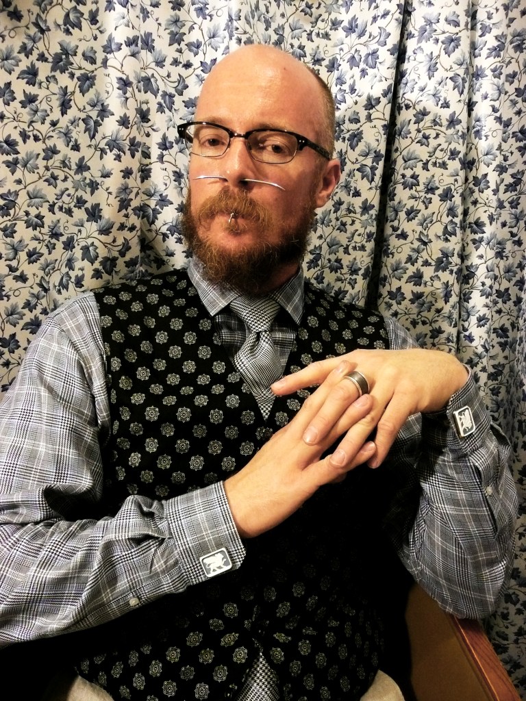 When I found the shirt and realized I had the tie for some time, I *squeeee*d a bit. Seriously. When I got dressed last Saturday evening, I tingled some; my nipples got hard. For real. On my way home, when I realized I had to dig out the Waverly print for the backdrop, I giggled all the way home.
